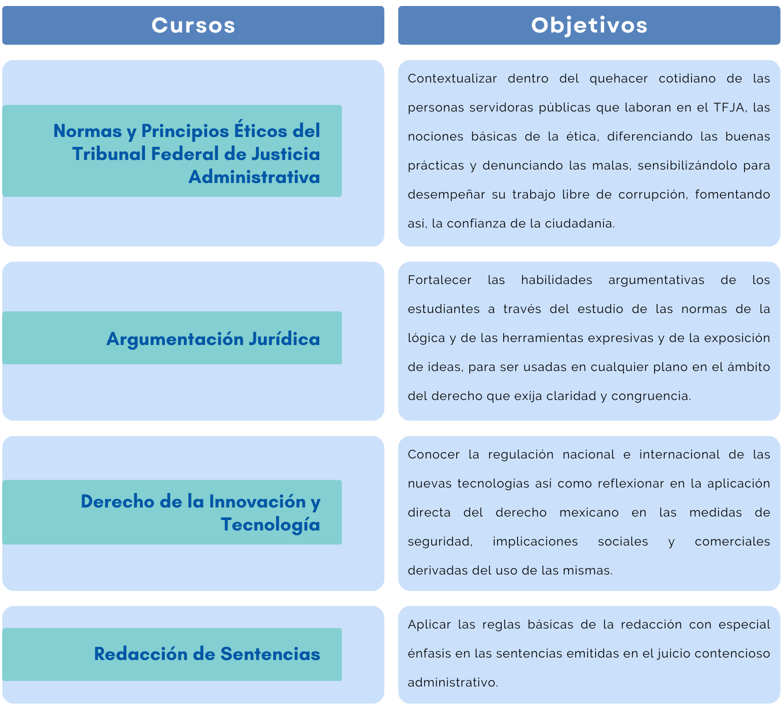 Le presentamos el catálogo de cursos que ofrece el Tribunal Federal de Justicia Administrativa en su modalidad a distancia, los cuales, han sido desarrollados por expertos en cada materia para coadyuvar a la perfección de las habilidades y capacidades profesionales de las personas servidoras públicas del TFJA.
